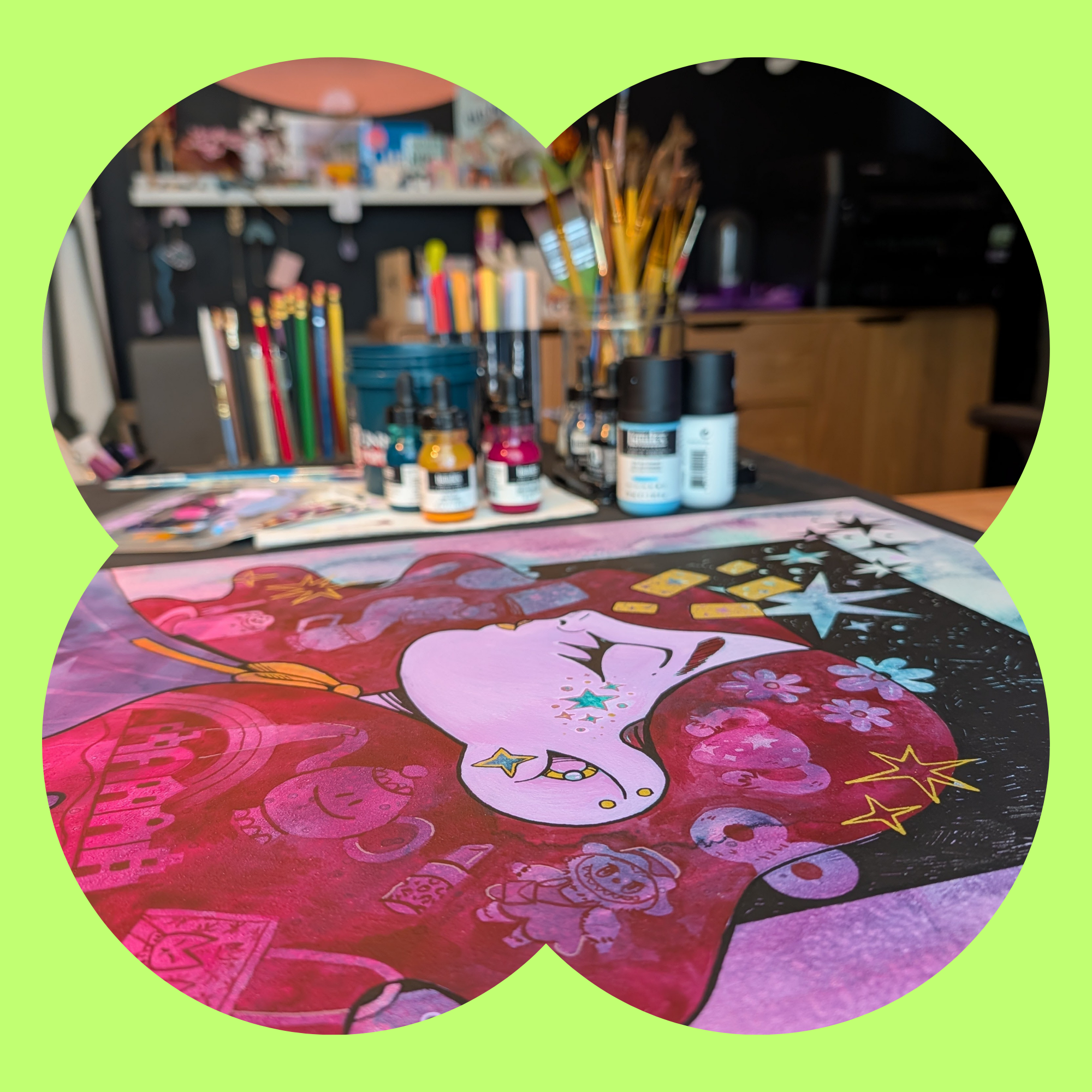"This year, I wanted to delve further into Emma's love of curating and collecting the objects that share her space by combining my love of layering acrylic inks and gouache with a surrealist, whimsical composition. Sentimental is a glimpse at some of the cherished memories and items Emma keeps close. "