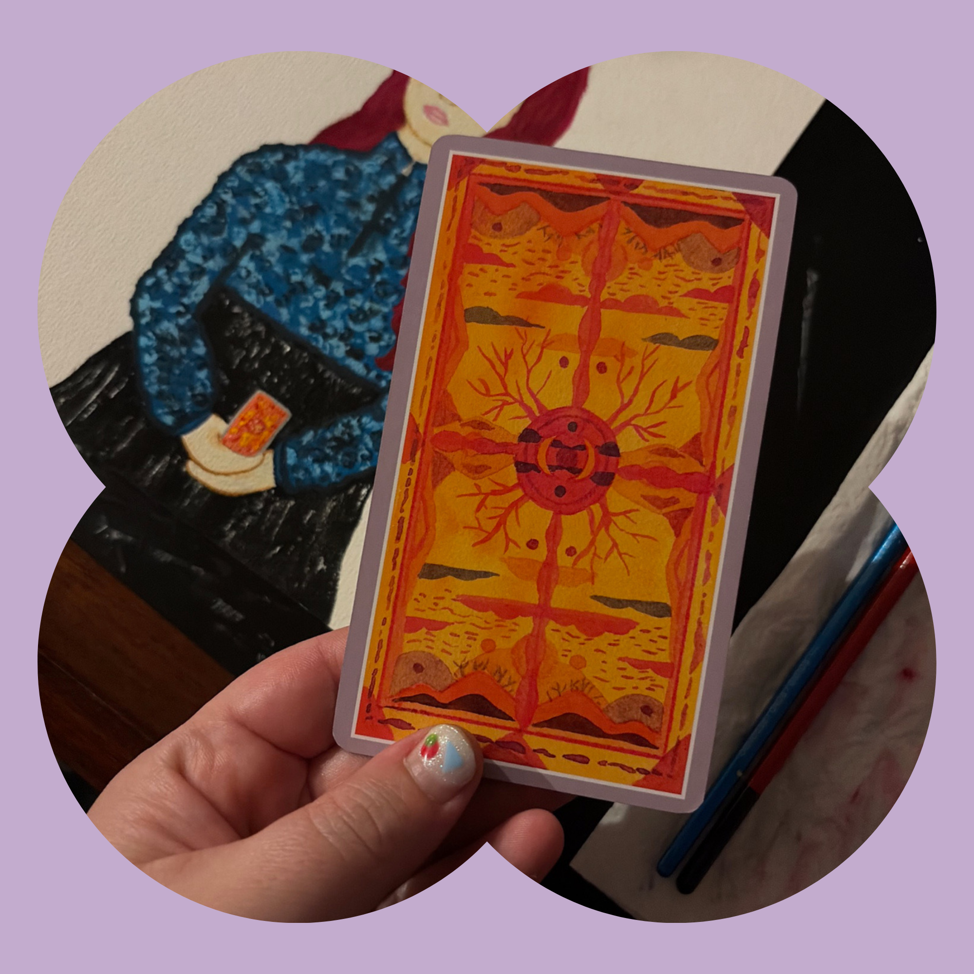 The scale of the slate was similar to a tarot card, iconography which informs all my self-portraits, so I decided to once again treat the portrait as though it were the surface of a card. I used layers of gouache to create a textured sky on the slate. I then painted a test portrait on water colour paper and was so pleased with it I decided to go with a mixed media moment and cut it out, along with some little stars, which I attached to the painted slate.
